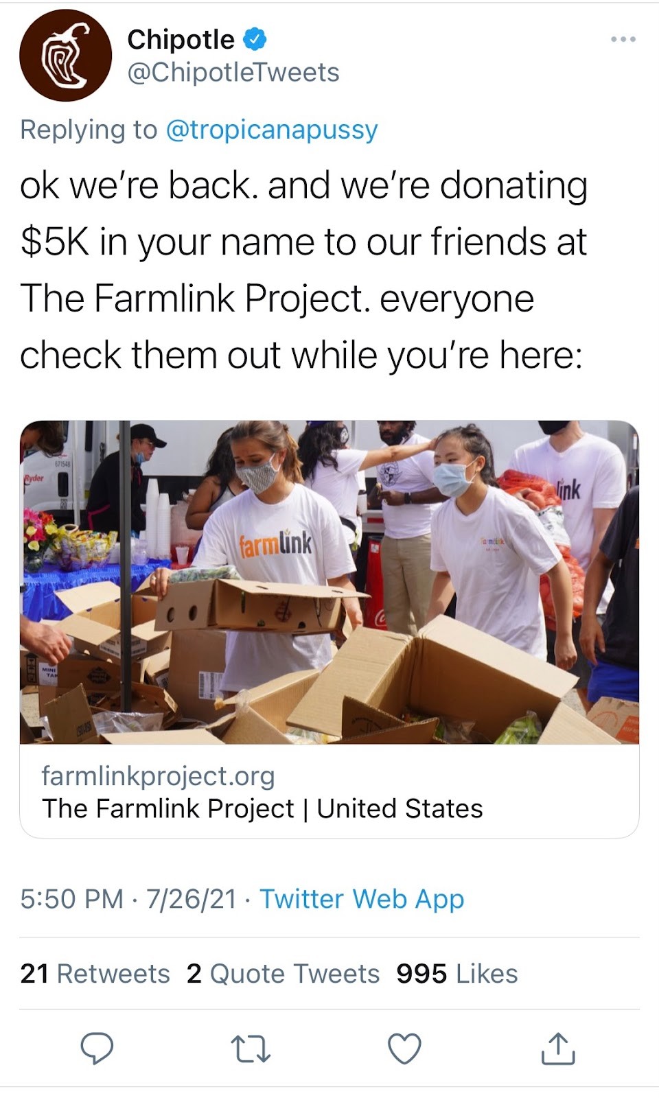 An incredible partner of The Farmlink Project since November of 2020, Chipotle accepted Abdis challenge and knew exactly how to make a huge impact in doing so. The company tweeted again a few days later, announcing a $5,000 donation to The Farmlink Project in Abdis name, allowing us to provide 75,000 pounds of produce to people in need. We asked Abdi if he wanted us to send this produce to any communities in particular, and he replied asking about the Twin Cities area in Minnesota.