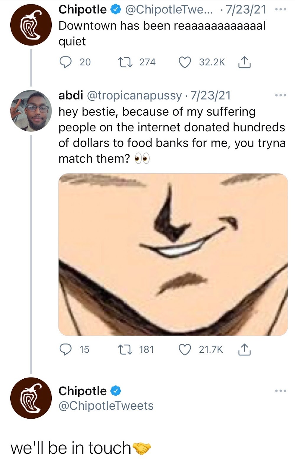 Inspired by the chain of donations on Twitter, Abdi decided to take this opportunity to encourage Chipotle to give back as well. The first thing I always think about whenever a corporation interacts with my tweets is trying to get them to do something good, he expressed, a sentiment reflective of his compassionate nature. Though never expecting anything to come of it, Abdi tweeted back at Chipotle, playfully challenging the company to match the Twitter donations to food banks. So many people who arent a billion-dollar corporation were donating hundreds and hundreds of dollars, so I figured Chipotle could give some, too, he said. He was shocked to see that, soon after, Chipotle had replied to him, mysteriously promising to be in touch.