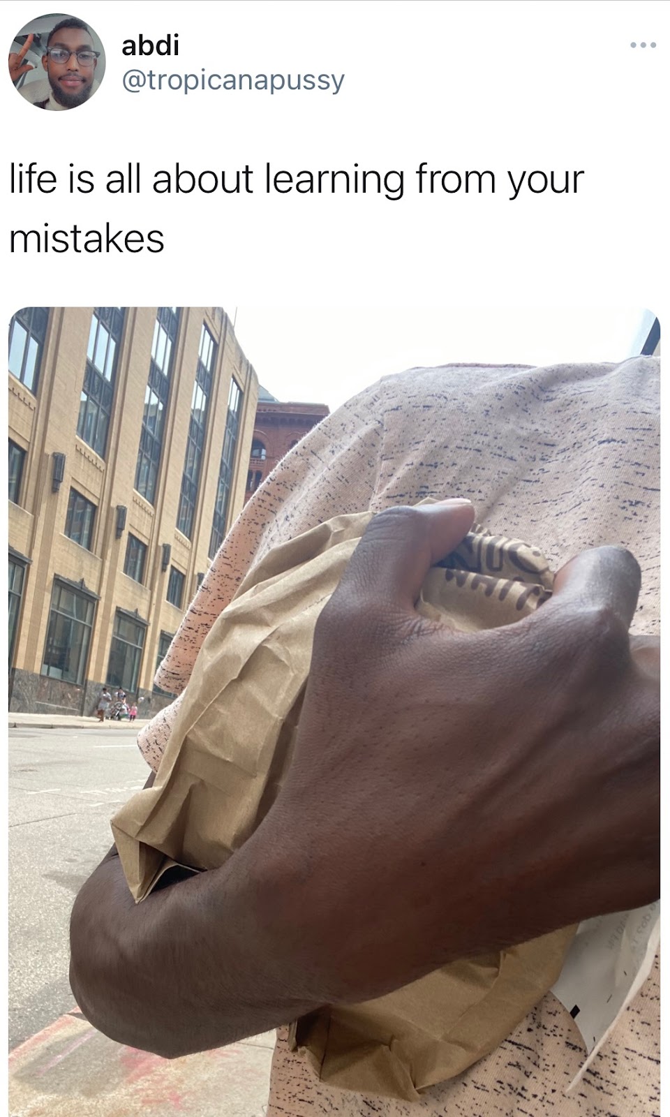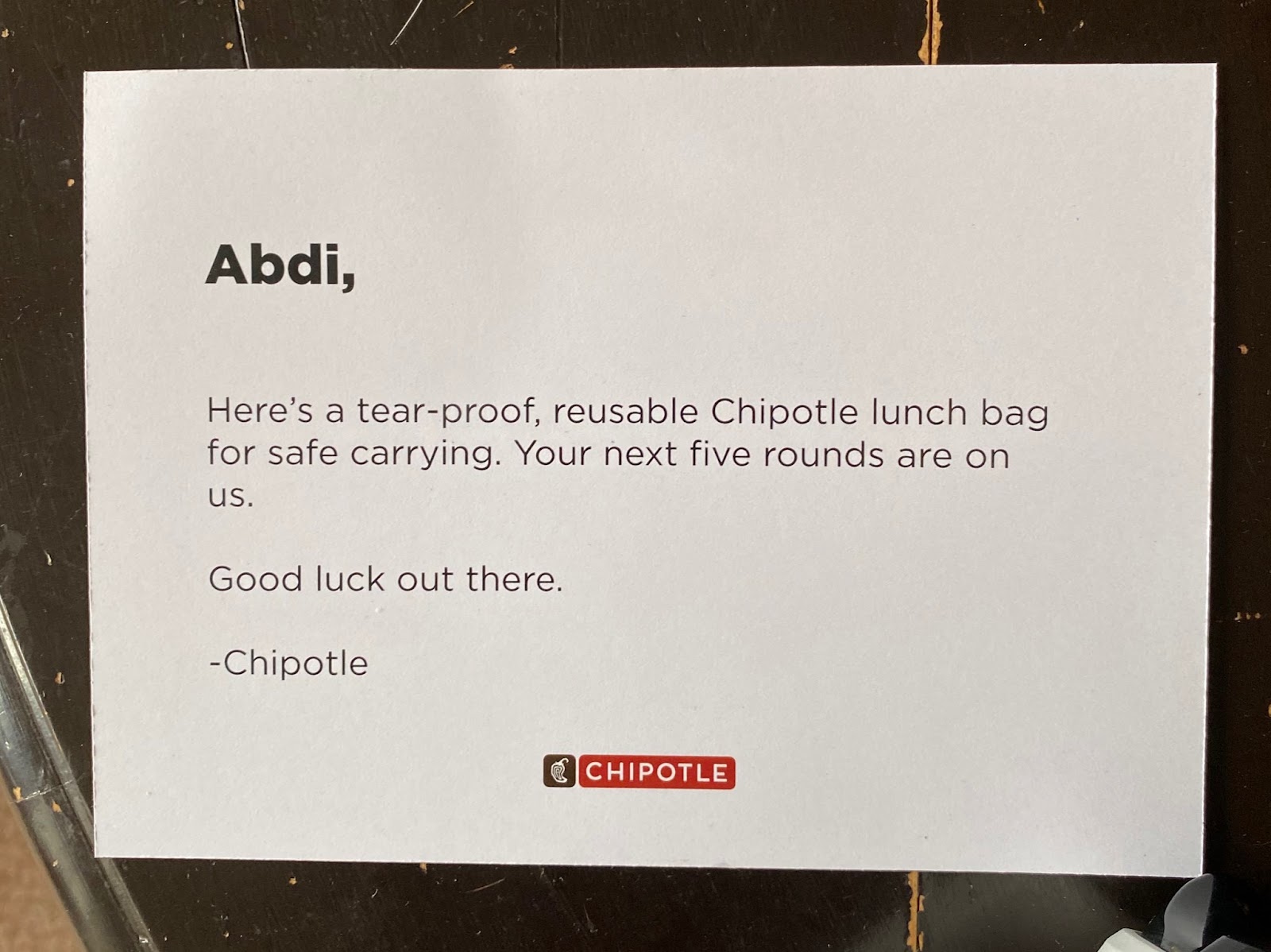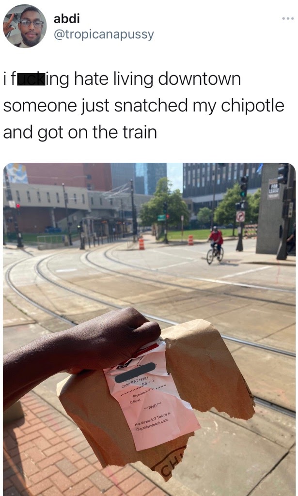 Abdi, a student at Minnesota State University, Mankato and writer for schoolz.com, an online tool for teachers to help promote diversity and inclusivity in educational programs, tweeted a photo of his torn bag, joking to his Twitter followers about the loss of his meal. It wasnt long before the tweet went viralpeople from all over the country replied, many sending quips and posting memes about the stolen bottom half of his meal and the meager bit of the bag remaining in his grasp. Some even criticized him for the way he held it, which prompted his next tweet a couple days later in which he jokingly cradled a Chipotle bag like a football.