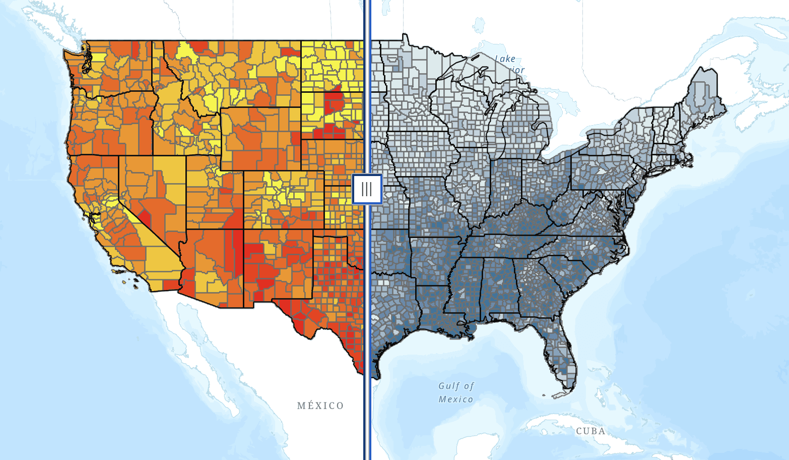 Each layer displays either food insecurity rates or climate vulnerability. To the left, the closer a county is to red, the higher its food insecurity is. To the right, the closer a county is to dark blue, the more vulnerable it is to climate changewhether thats from weakened infrastructure, systemic poverty, or physical exposure to weather events. Sliding the tool in the middle enables viewers to compare food insecurity and climate vulnerability in each county, telling the story that grounds Farmlinks work and vision for change.
