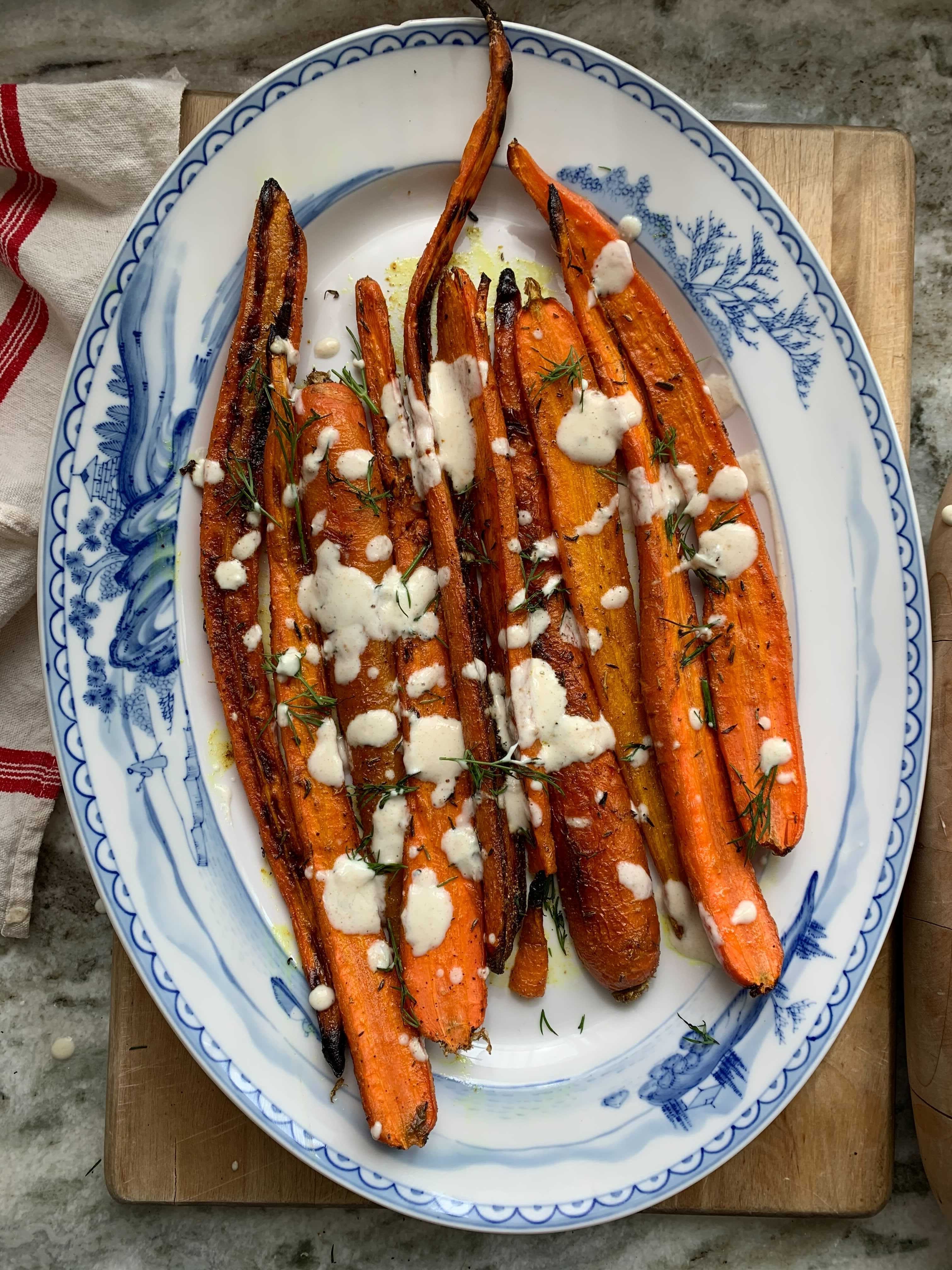 Remove carrots from oven, top with tahini-lemon sauce and dill, and serve immediately
